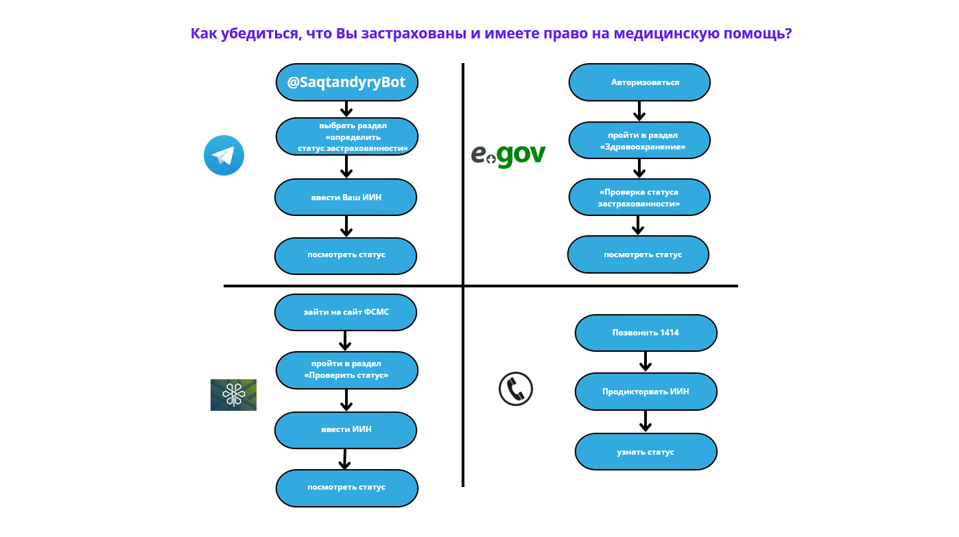 Найти бота: @SaqtandyryBot (бот ФCМС), выбрать раздел «определить статус застрахованности», ввести Ваш ИИН и посмотреть статус: застрахован/не застрахован.