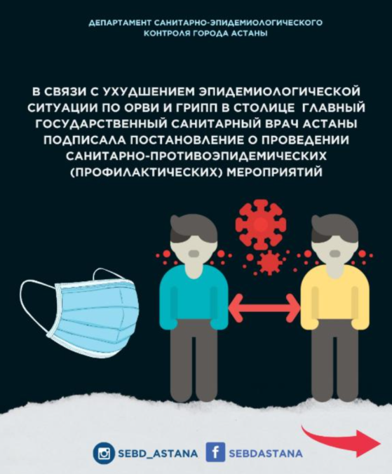 В связи с ухудшением эпидемиологической ситуации по ОРВИ и грипп в столице Главный государственный санитарный врач Астаны подписала постановление о проведении санитарно-противоэпидемических (профилактических) мероприятий